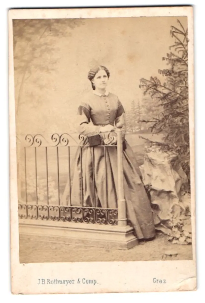 Fotografie J.B. Rottmayer & Comp., Graz, Haynau-Gasse 197, Dame an schmiedeeisernem Zaun