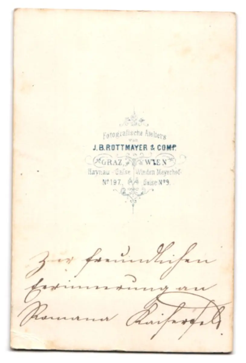 Diese CDV Fotografie fängt die Anmut einer eleganten Dame ein, die in einem prachtvollen Kleid der damaligen Mode an einem kunstvoll gestalteten schmiedeeisernen Zaun lehnt. Der Hintergrund zeigt eine malerische Szenerie mit üppigem Grün und Felsen, die der Szene eine natürliche und harmonische Atmosphäre verleihen. Die Komposition spiegelt den zeitgenössischen Charme und die Eleganz wider, die in dieser Epoche geschätzt wurden., Rückseite beschrieben, guter Zustand Größe ca. 7,0 x 10,5cm