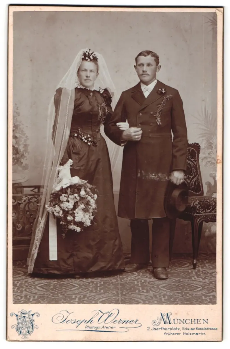 Fotografie Joseph Werner, München, 2. Jsarthorplatz, Hochzeitspaar mit Blumenschmuck