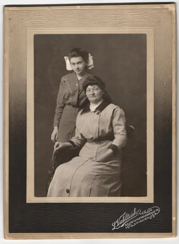 Fotografie L. Vahlteich, Chicago, Mutter und Tochter in Kleidern posieren im Atelier, 1913