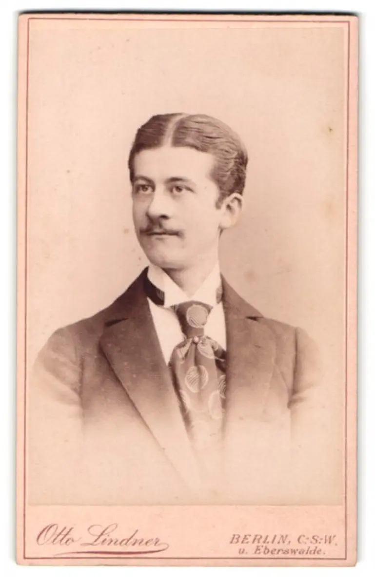 Diese CDV Fotografie präsentiert das elegante Porträt eines jungen Herrn aus einer vergangenen Epoche. Sein gepflegtes Erscheinungsbild wird durch einen sorgfältig gestylten Schnurrbart und ein stilvolles Halstuch unterstrichen. Der Anzug, den er trägt, zeugt von feinem Geschmack und einer Vorliebe für zeitlose Mode. Sein Ausdruck ist selbstbewusst und doch gelassen, was dem Bild eine besondere Anziehungskraft verleiht., guter Zustand