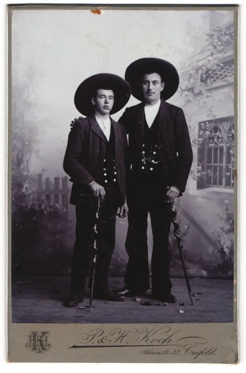 Fotografie P. & H. Koch, Crefeld, ziwe junge Handwerker / Zimmermänner auf der Walz mit Knotenstock, Zimmermannskluft