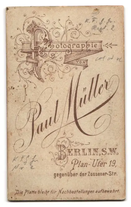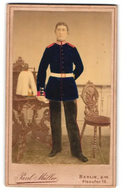Fotografie Paul Müller, Berlin, Planufer 19, Garde-Soldat in Uniform nebst Pickelhaube mit Paradebusch Inf.-Rgt. 2