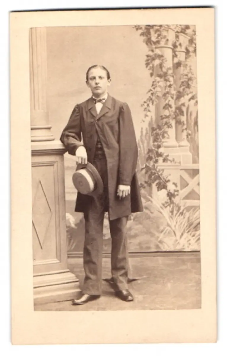 Fotografie Photog. Verein, Berlin, Portrait junger Mann Ernst Rauff im Anzug mit Sommerhut vor einer Studiokulisse