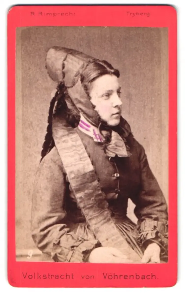 Diese eindrucksvolle CDV Fotografie zeigt eine Frau, die in die traditionelle Tracht von Vöhrenbach gekleidet ist. Ihr Gewand ist reich an Details, mit kunstvoll gearbeiteten Stoffen und einem charakteristischen Kopfschmuck, der die kulturelle Vielfalt und Tradition ihrer Region widerspiegelt. Die Pose und der Ausdruck der Frau strahlen Ruhe und Würde aus, während das fotografische Handwerk der Zeit eine Momentaufnahme der Geschichte bewahrt., guter Zustand Größe ca. 6,5 x 11,0cm