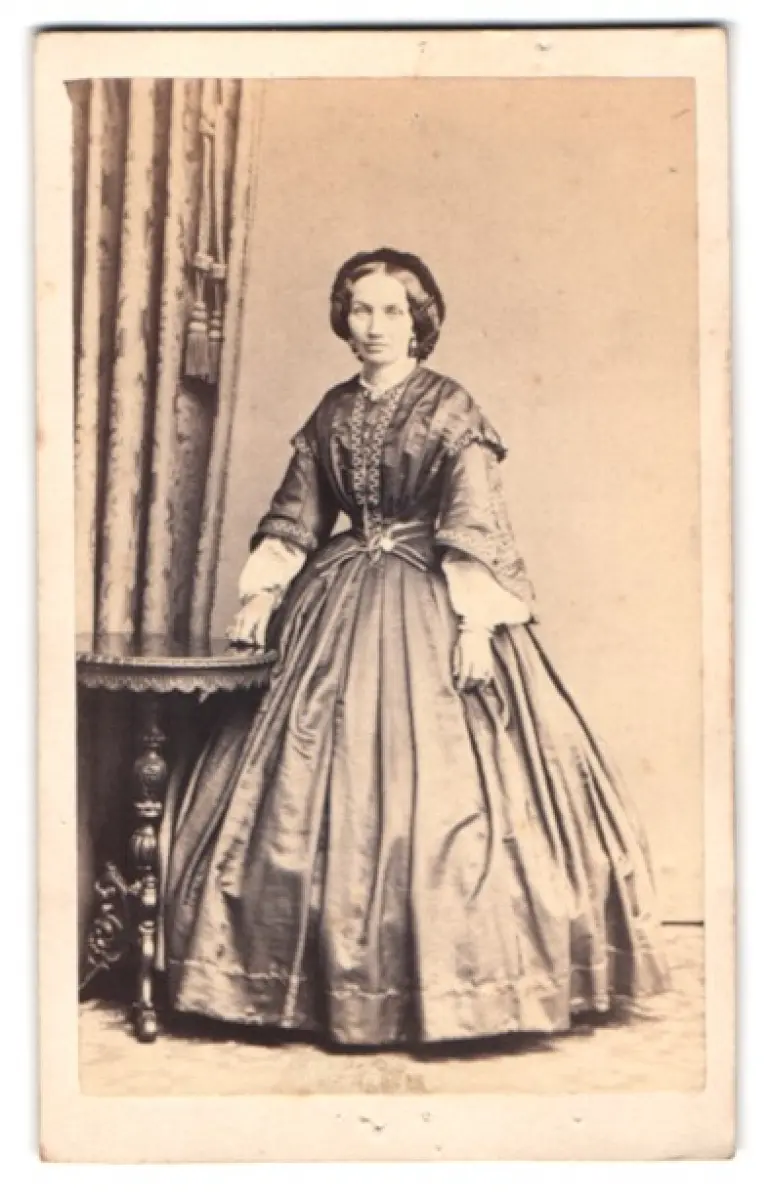 Fotografie Stiehm, Berlin, Dame im glänzenden Biedermeierkleid mit Ohrringen