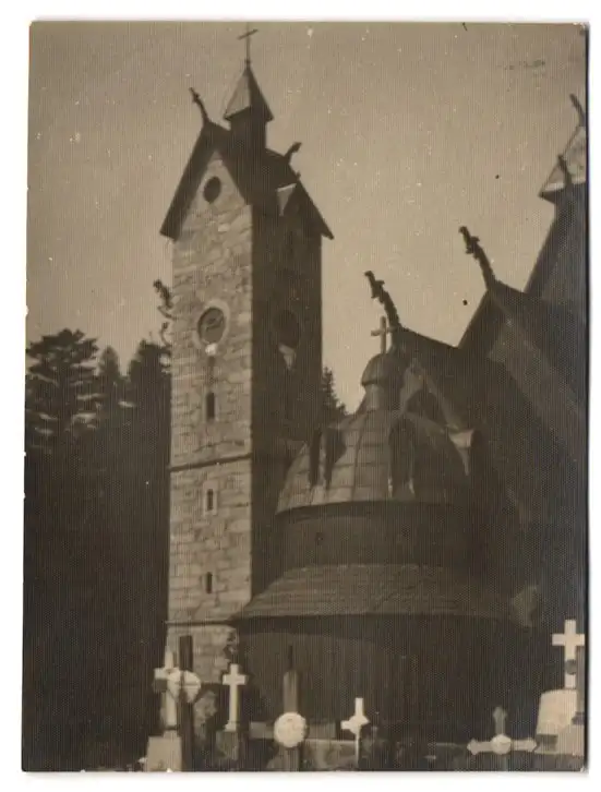 Fotografie unbekannter Fotograf, Ansicht Brückenberg, die Kirche Wang mit Gräbern