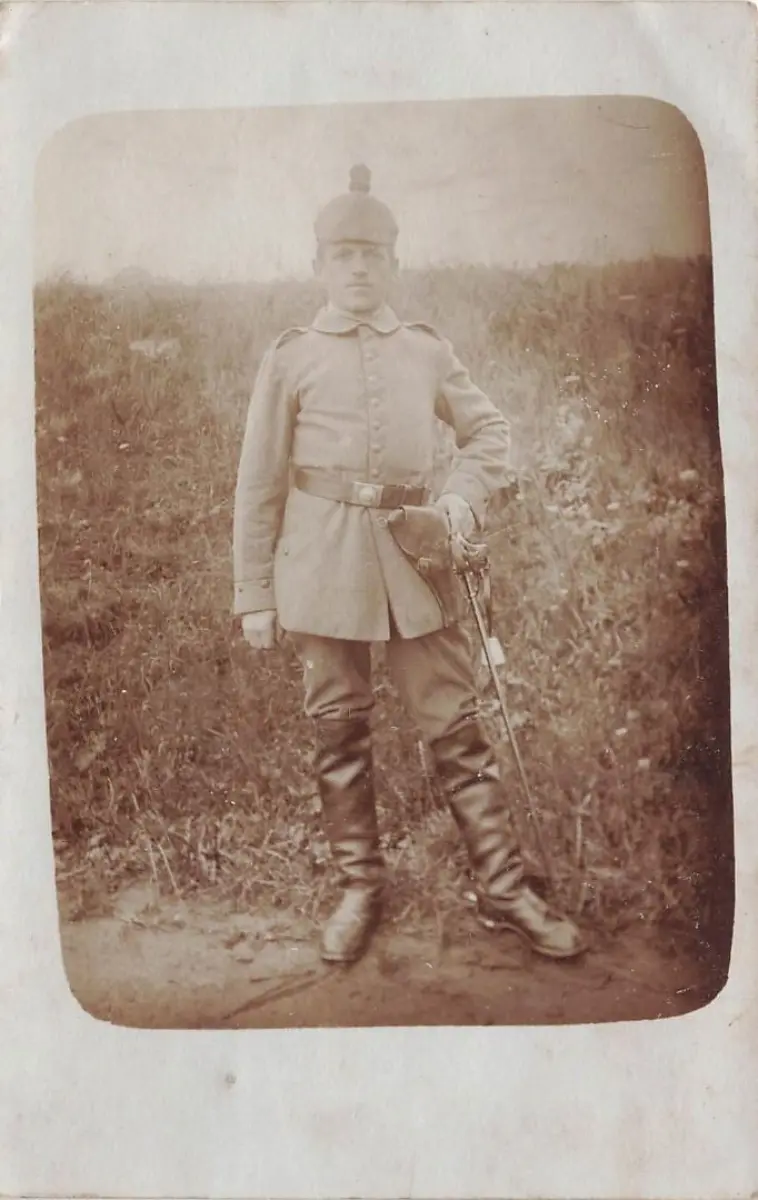 Fotokarte 1.WK deutscher Soldat mit Pickhaube Artillerie Pistole und Degen