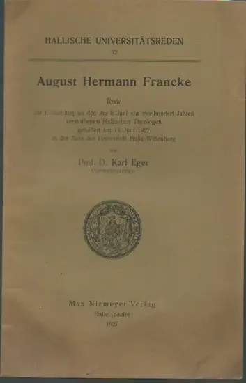 Francke, August Hermann. - Eger, Karl: August Hermann Francke. Rede zur Erinnerung an den am 8. Juni vor zweihundert Jahren verstorbenen Hallischen Theologen gehalten am 14.Juni 1927. (= Hallische Universitätsreden 32).