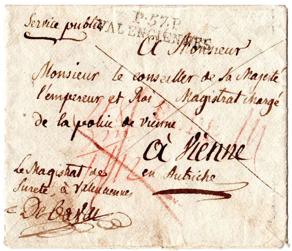 Dienstbrief-Umschlag (!) m. kpl. Inhalt v. Valenciennes n. Wien an Monsieur le conseiller de la Majeté lémpereur et Roi...