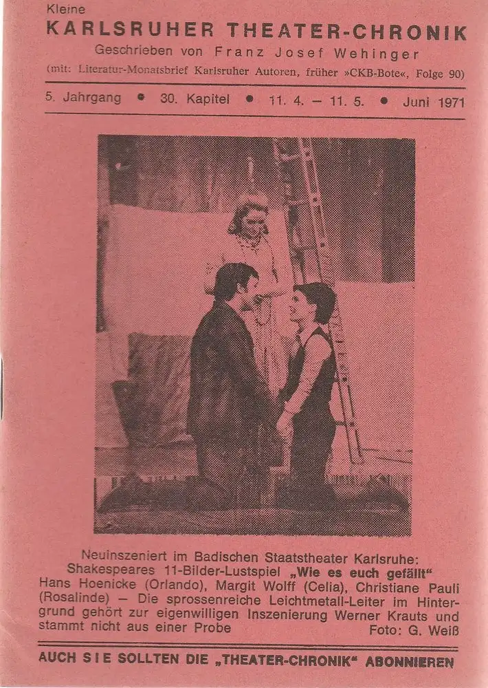 Franz Josef Wehinger: Kleine Karlsruher Theater-Chronik 5. Jahrgang 30. Kapitel 11. 4. - 11. 5. Juni 1971.