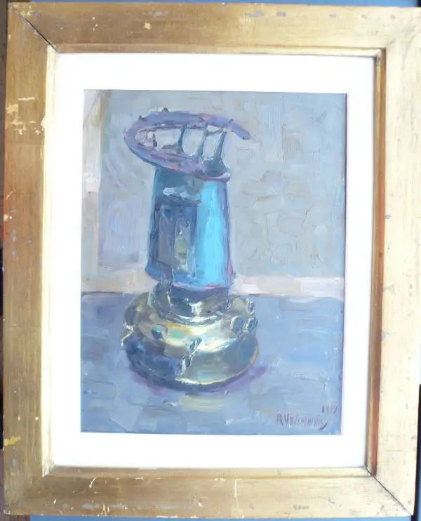 Französicher Maler um 1900,, Messing Öllampe. Ölstudie auf Holz