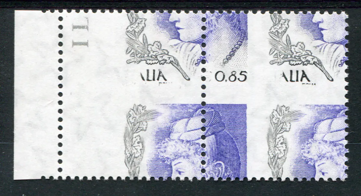 Frau in der Kunst Euro 0,85 horizontales Paar mit stark in beide Richtungen verschobener Verzahnung, so dass das linke Exemplar nicht den Nennwert aufweist, sondern einen Teil der Randangaben des Blattes enthält - Nur 10 Exemplare des Blattes weisen diese Eigenschaften auf - Ungewöhnlich Cod. 659/WEB