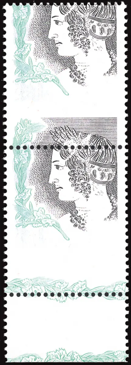 MNH - Vollgummi - - Frau in der Kunst (Euro 0,05) Nr. 2393 vertikales Paar unterer Blattrand, ohne Schwarzdruck mit stark nach unten verschobener horizontaler Verzahnung, auch der Interferenzdruck wird verschoben - aufgrund des fehlenden Schwarzes ist es unmöglich, die Zugehörigkeit zur ersten, zweiten oder dritten Ausgabe festzustellen - Schön und ungewöhnlich Cod.782/182