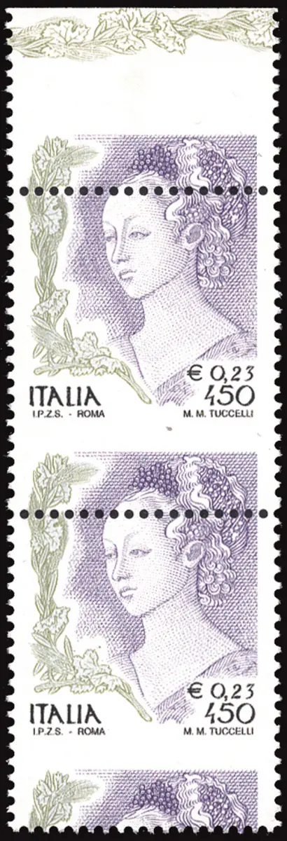 MNH - Vollgummi - - Frauen in der Kunst Lire 450 / Euro 0,23 Nr. 2394 vertikales Paar b. von f. oben mit stark verschobener horizontaler Verzahnung (Kat. Einheitliche Nr. 2430Bb, 2430Bc) - Selten - Kat. euro 600 Cod.784/182