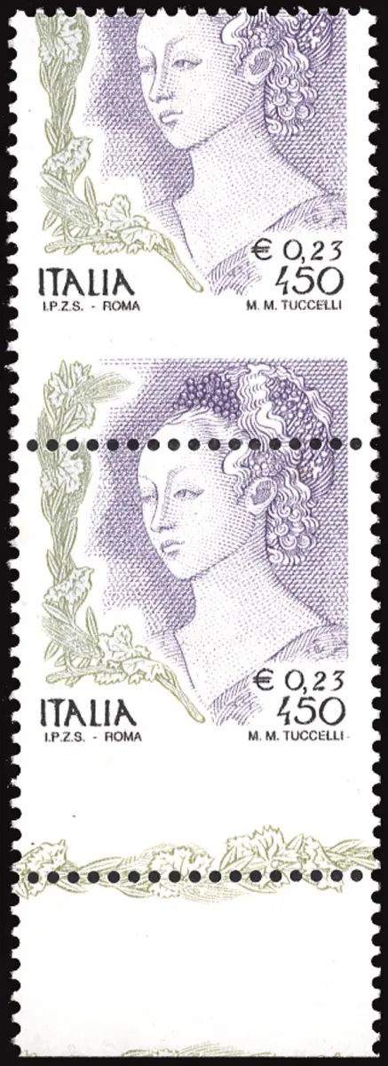MNH - Vollgummi - - Frauen in der Kunst Lire 450 / Euro 0,23 Nr. 2394 vertikales Paar b. von f. unten mit stark verschobener horizontaler Verzahnung (Kat. Einheitliche Nr. 2430Bb) - Ungewöhnlich - Kat. euro 400++ Cod.785/182
