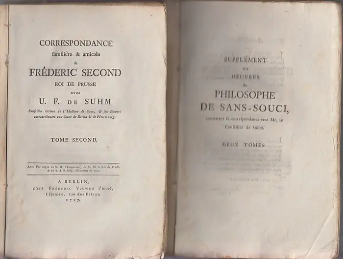Frederic II (Friedrich II.). - U. F. de Suhm: Correspondance familiere et amicale de Frederic second, Roi de Prusse, avec U. F. de Suhm, Conseiller intime de l'Electeur de Saxe, & son envoye extraordinaire aux Cours de Berlin & de Petersbourg. 2 tomes.