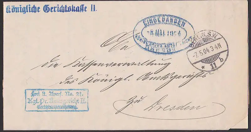 Frei lt. Avers No. 21 Kgl. Pr. Amtsgericht Berlin 7.5.04 nach Dresden, Faltbrief
