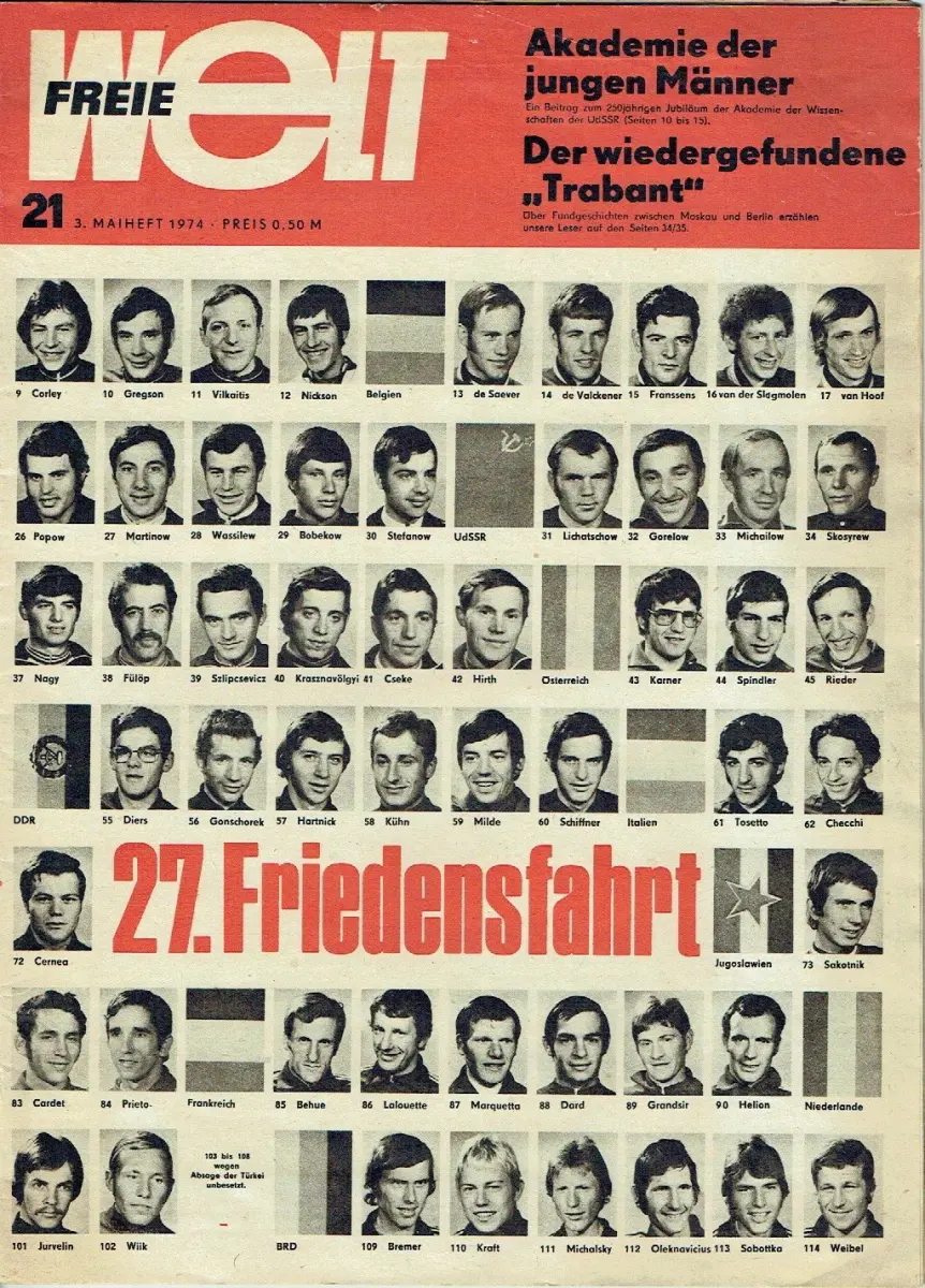 guter bis sehr guter Zustand, geringe Gebrauchs- und Alterungsspuren: Papier teils etwas vergilbt, aber Seiten sauber und ordentlich - teils etwas eselsohrig - kleine Blessuren, Zeitung der DDR enthält u. a. Reklame, Romane, Kurzerzählungen, Rätsel, Karikaturen, Reportagen, Artikel über DDR-Politik, Sport und Leben, Technik und Wissenschaft, Reportagen aus der deutschen, sowjetischen und internationalen Geschichte und dem Fernsehprogramm der Woche etc. hier zusätzlich auf den beiden Umschlagseiten kleine Fotos aller Teilnehmer der Friedensfahrt, Softcover, ca. 26 x 36 cm, 40 Seiten mit zahlreichen Bildern
