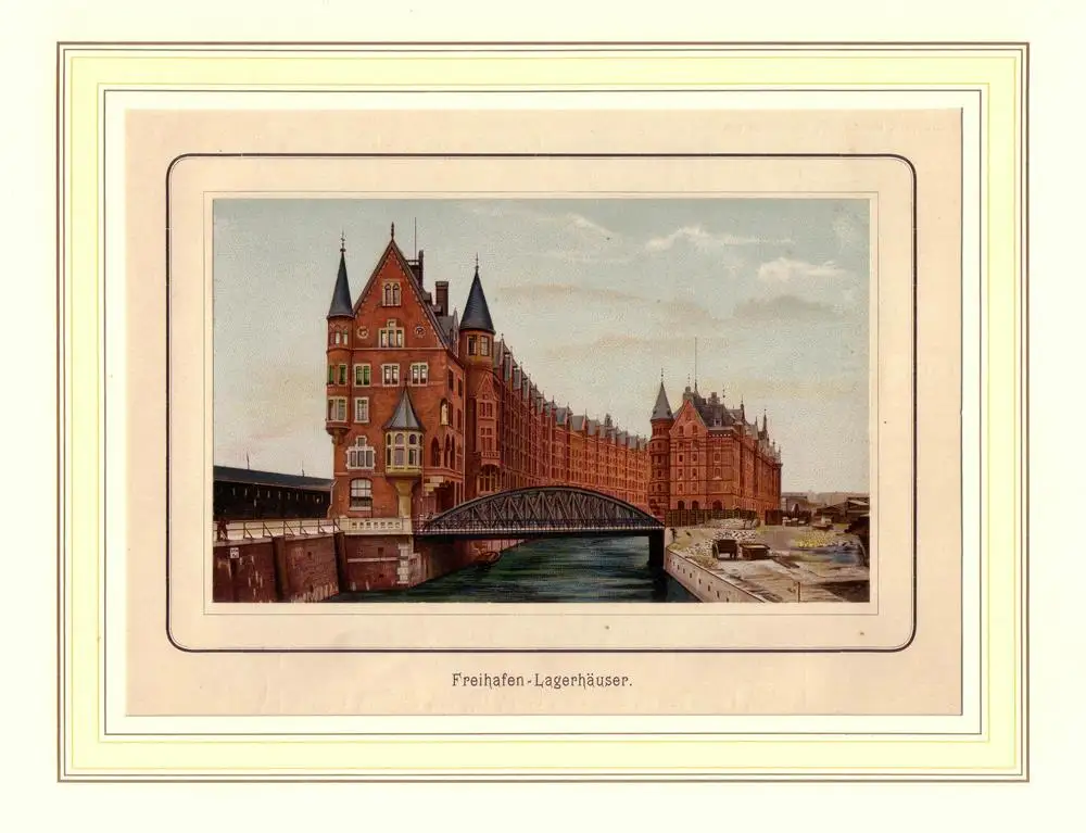 Freihafen-Lagerhäuser. Aufgewalzte Chromolithographie