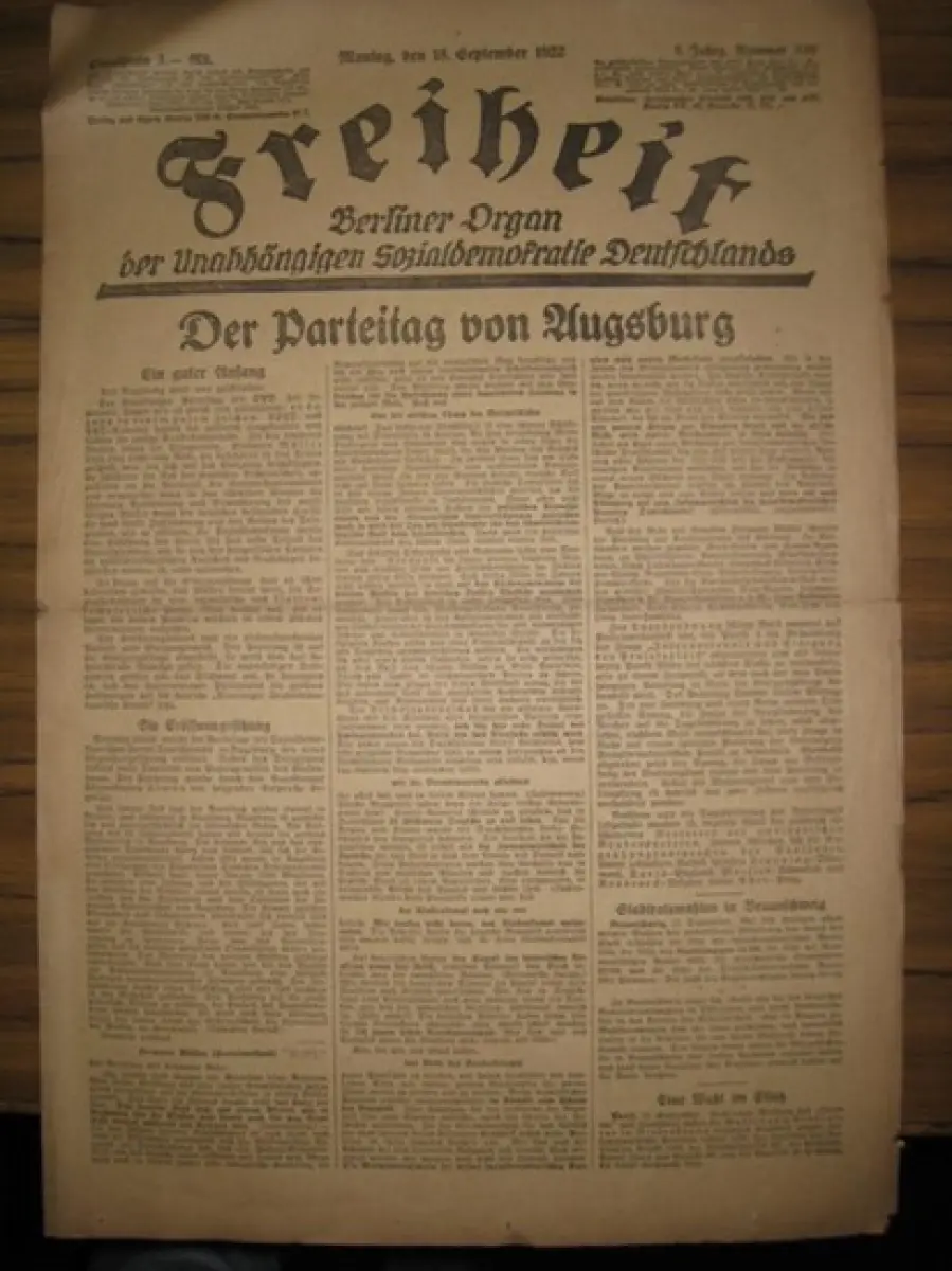 Freiheit, Die. - USPD. - Dönhoff (Red.): Die Freiheit. 5. Jahrgang 1922. Montag, den 18. September Nr. 336. Berliner Organ der Unabhängigen Sozialdemokratischen Partei Deutschlands. Inh.u.a.: Der Parteitag von Augsburg / 120000 Opfer in Smyrna / Englands
