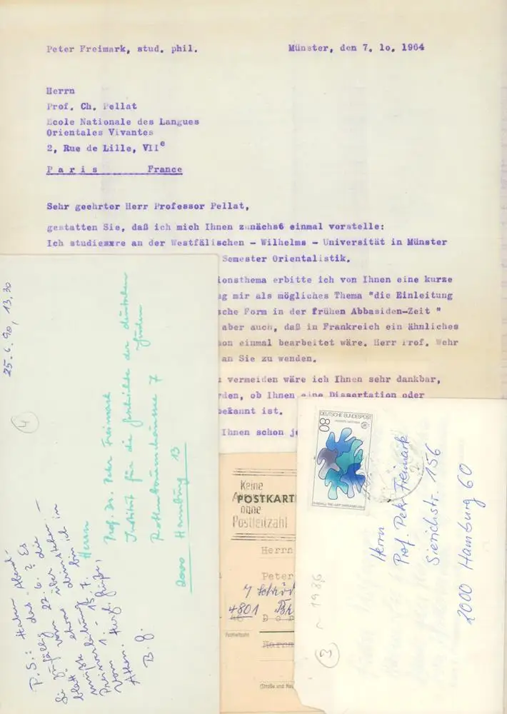 [1.] Durchschlag eines maschinenschriftl. Briefes (Münster 7.10.1964) von Peter Freimark an Prof. Ch. Pellat in Paris wg. Abklärung von Freimarks geplantem Dissertations-Thema "Die Einleitung arabischer Bücher als literarische Form in der frühen Abassiden-Zeit". 1967 erschien seine Dissertation unter dem Titel "Das Vorwort als literarische Form in der arabischen Literatur". - [2.] Maschinenschriftl. Postkarte des Orientalisten Karl-Heinz Pampus (Bonn 15.8.66) mit eigenhändiger Unterschrift: "In medias res: die strittige Arbeit liegt mir vor, - d. h. es ist keine eigentliche Arbeit, sondern lediglich ein wiss. Aufsatz von acht doppelspaltigen Quartseiten - also wohl keine Konkurrenz für eine Diss., el-hamdulüllah!... Herzl. Grüße für Weib und Mutter! Dein Pimp". - Leicht gebräunt. - [3.] Handschriftl. Kärtchen (6,5 x 12,5 cm) des Hamburger Druckers und Verlegers Kurt J. Christians für die Zusendung eines Saas-Fée-Artikels: "Mußte ihn gleich im Kontor lesen, großartig geschrieben". - [4.] Kopie der Dankesrede von Barbara Gerber anlässlich der Verleihung des Kurt-Hartwig-Siemers-Preises 1989 für ihre Arbeit "Jud Süß. Aufstieg und Fall im 18. Jahrhundert". Mit handgeschrieb. Umschlag (Adresse, Absender und Postskriptum). - [5.] Maschinenschriftl. Brief des ehemaligen Hamburger Kultursenators Wolfgang Tarnowski (dat. 13.3.1991) mit eigenhändiger Unterschrift. "Hut ab vor so viel Fleiß und Gelehrsamkeit... Es ist einfach fabelhaft, was für eine Förderung von Ihrem Institut ausgeht.". - Der Judaist und Islamkundler Peter Freimark (1934-2008) leitete von 1972 bis 1993 das "Institut für die Geschichte der deutschen Juden" in Hamburg und publizierte u.a. zur Geschichte der Hamburger Juden, zu den Weltreligionen u.a.m. und widmete sich intensiv den Fragen historischen Erinnerns