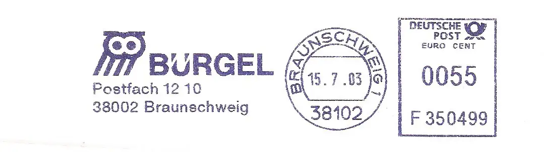 Freistempel F350499 Braunschweig - BÜRGEL (Abb. Eule) (#2947)