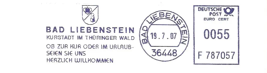 Freistempel F787057 Bad Liebenstein - Kurstadt im Thüringer Wald - Ob zur Kur oder im Urlaub... (Abb. Wappen) (#2171)