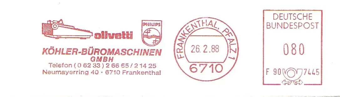 Freistempel F90 7445 Frankenthal Pfalz - KÖHLER BÜROMASCHINEN GMBH - olivetti / PHILIPS (Abb. Schreibmaschine) (#2047)