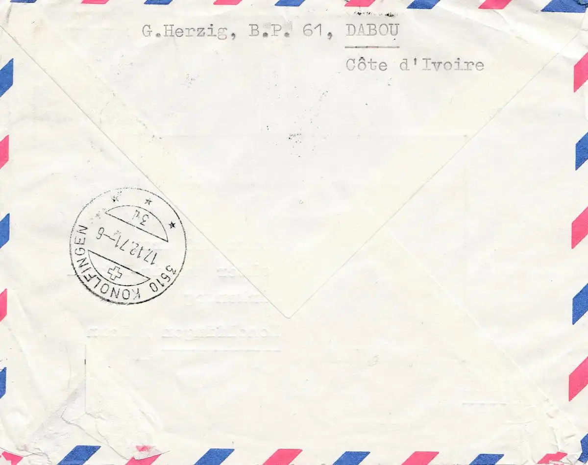 French colonies: Ivory coast: 1971 par avion to Berne, forwarded to Thun