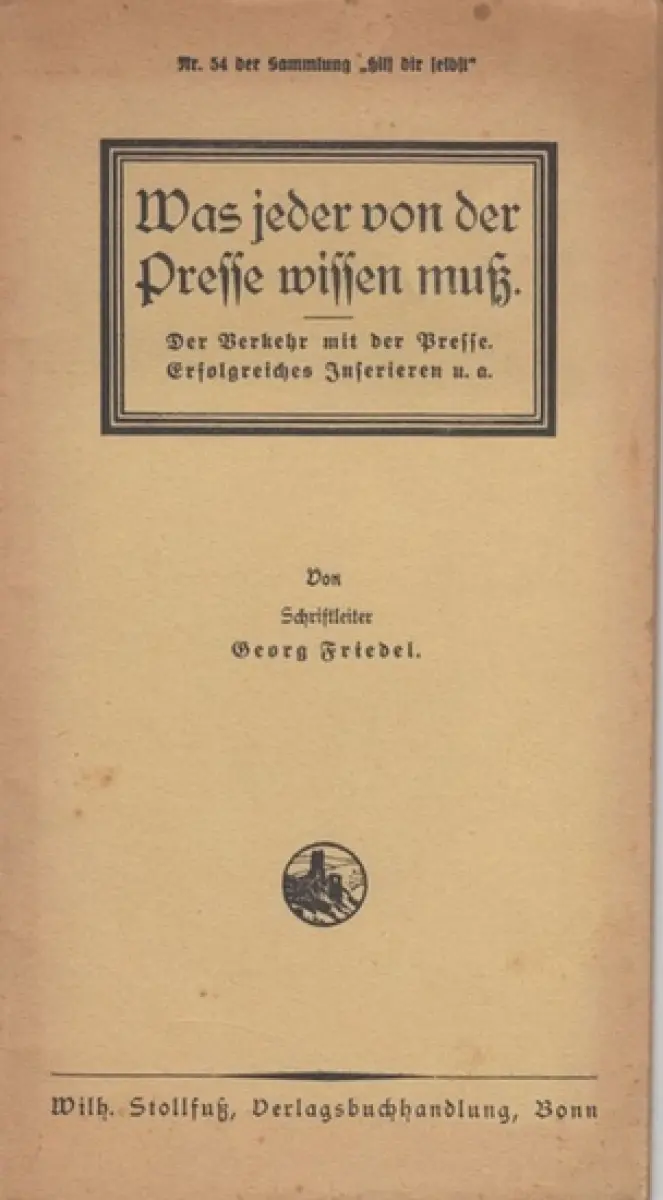 Friedel, Georg: Was jeder von der Presse wissen muß. Ein Hilfsbuch für alle, die mit der Presse in Verkehr stehen. Presse-Berichte und Notizen. Erfolgreiches Inserieren ( = Nr. 54 der Sammlung 'Hilf dr selbst' ).