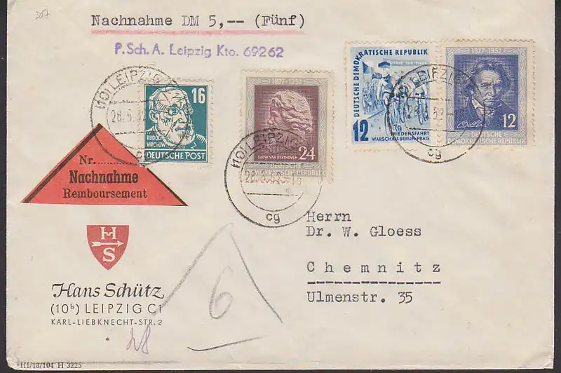 Friedensfahrt 1952 in MiF auf Nachnahme-Bf Leipzig 28.5.52 (307), Bike, Ludwig van Beethoven