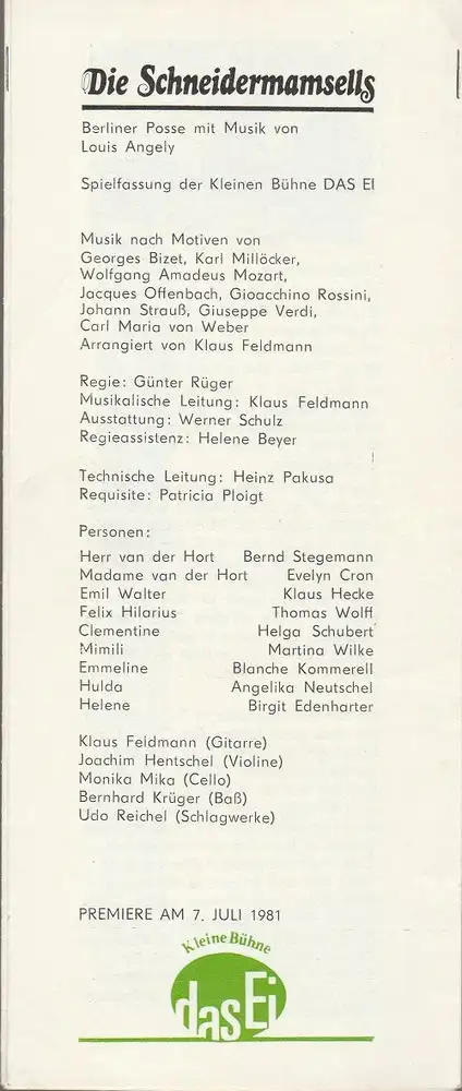 Titel: Programmheft Louis Angely / Karl von Holtei DIE SCHNEIDERMAMSELLS / EIN ACHTEL VOM GROSSEN LOOSE Premiere 7. Juli 1981 / 1. Juli 1982 kleine Bühne Das Ei