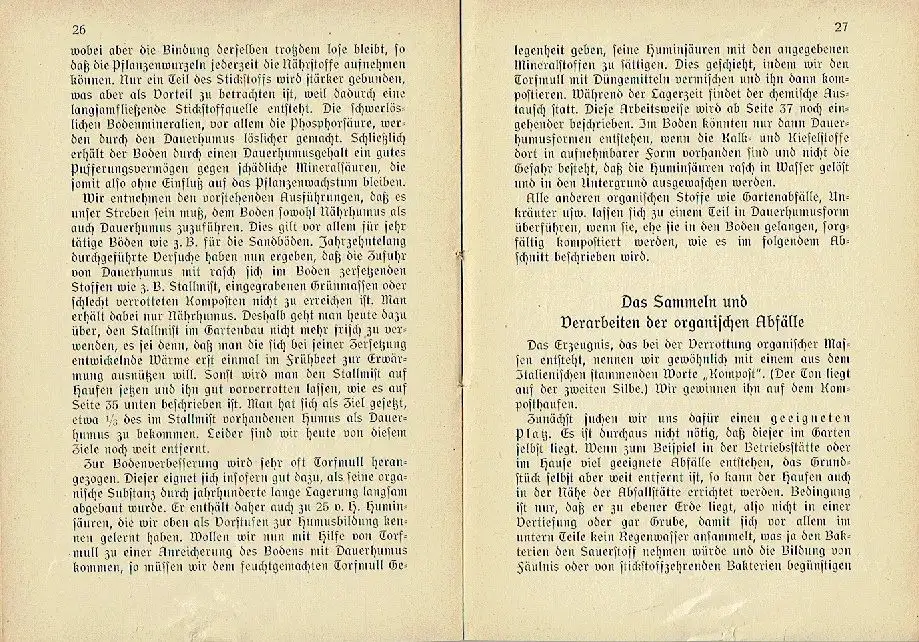 guter Zustand, geringe Gebrauchs- und Alterungsspuren: Papier teils etwas vergilbt, aber Seiten sauber und ordentlich - Rückseite teils geknickt und mit Dreiangel (ca. 2 cm eingerissen) - ab Seite 25 Seiten an Ober- und Unterkante teils leicht knittrig - Fadenbindung (und damit erster Bogen = Seite 3-14) etwas gelockert, zur Datierung siehe Seite 49 (Datum der Kundenschreiben) Zur EinführungDer Wert des StallmistesDer Humus und die BakterienDie Leistung des Humus im BodenDie Natur des HumusDas Sammeln und Verarbeiten der organischen AbfälleLaub- und MisterdenDas TorfschnellkompostverfahrenDie Anwendung des Torfschnellkompostes, kartoniert, ca. 12 x 16, 48 Seiten mit 6 Bildern + weitere 16 Seiten Verlagswerbung