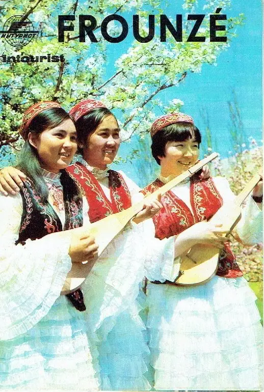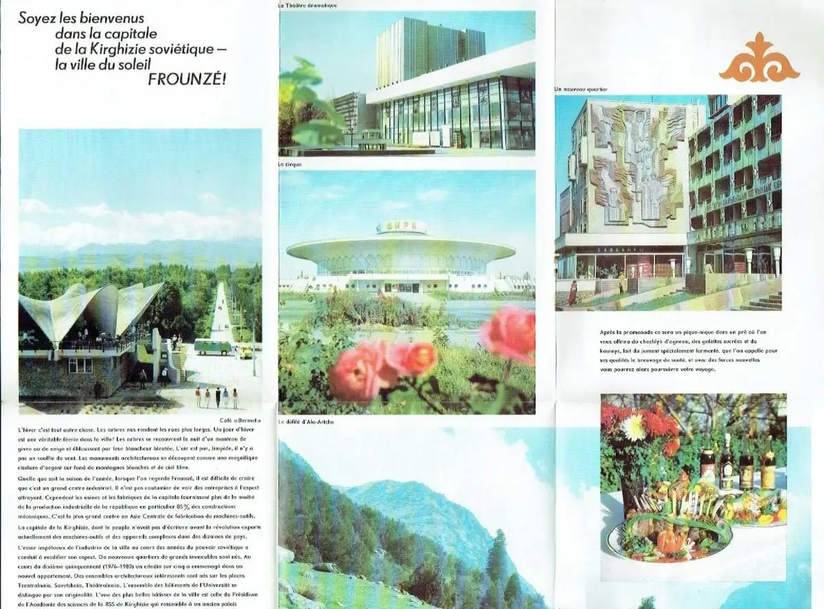 sehr guter Zustand, geringe Gebrauchs- und Alterungsspuren, Werbe-Prospekt mit Beschreibung und Informationen zur Hauptstadt von Kirgisistan in französischer Sprache, Papier, ca. 13 x 19,5, 12 Seiten mit 13 Bildern