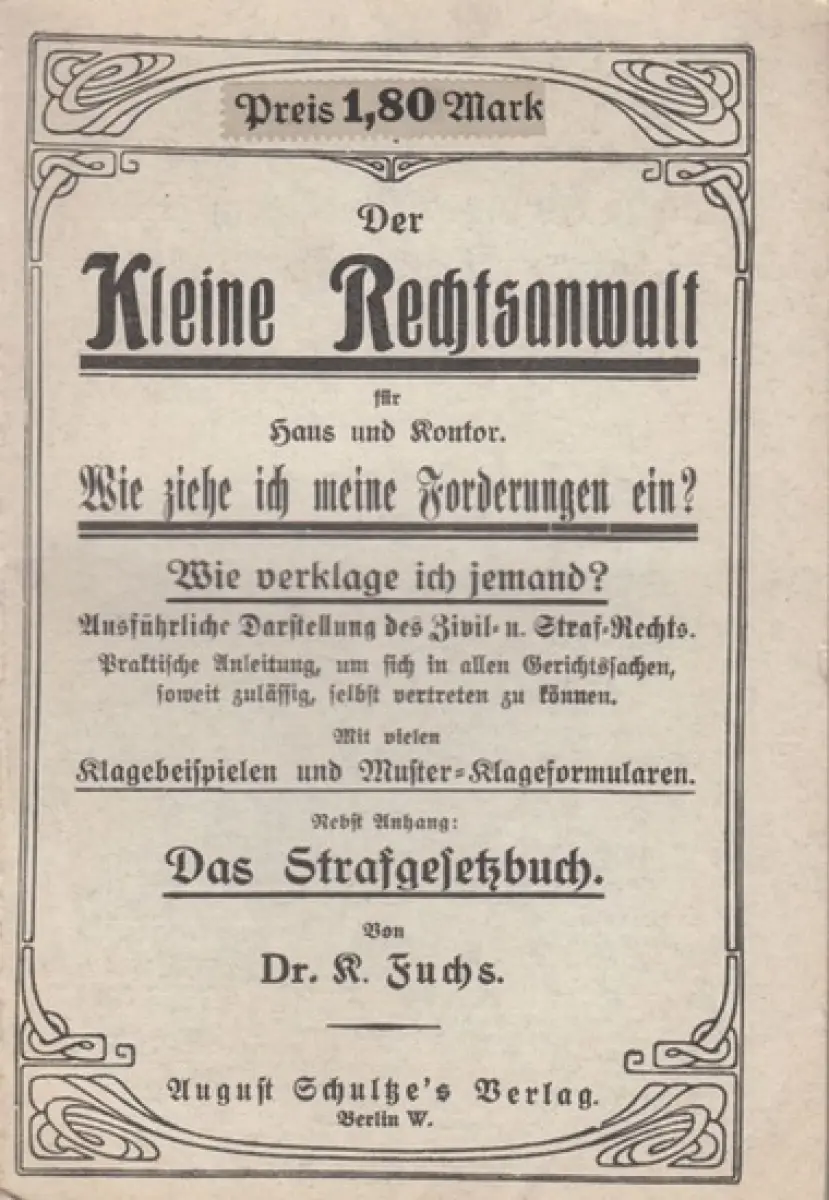 Fuchs, K: Der kleine Rechtsanwalt für Haus und Kontor. Wie ziehe ich meine Forderungen ein? Wie verklage ich jemand? Ausführliche Darstellung des Zivil- u. Straf-Rechts. Praktische Anleitung, um sich in allen Gerichtssachen, soweit zulässig, selbst vertre