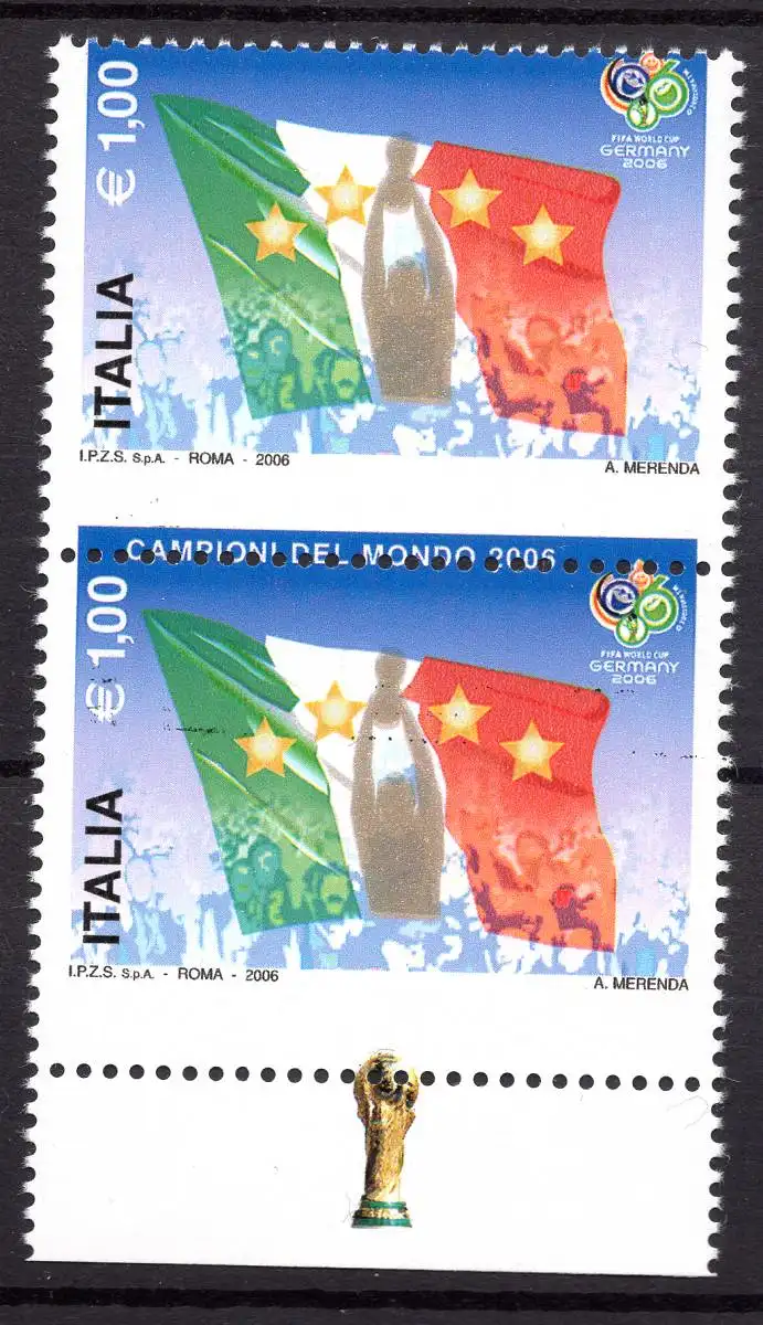 Fußball Italien Meister Nr. 2924 Paar unterer Blattrand mit Pokalanhang, der die stark vertikal verschobene Verzahnung aufweist, so dass der Schriftzug Weltmeister 2006 unten statt oben ist, das untere Exemplar ist ohne diesen Schriftzug - nur ein Exemplar des Zettels hat das Band mit Pokal und hat keinen Schriftzug oben Cod. 194/WEB