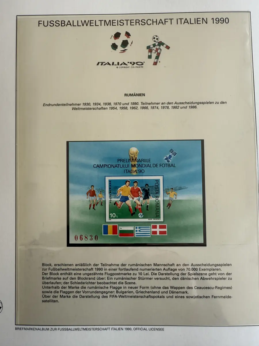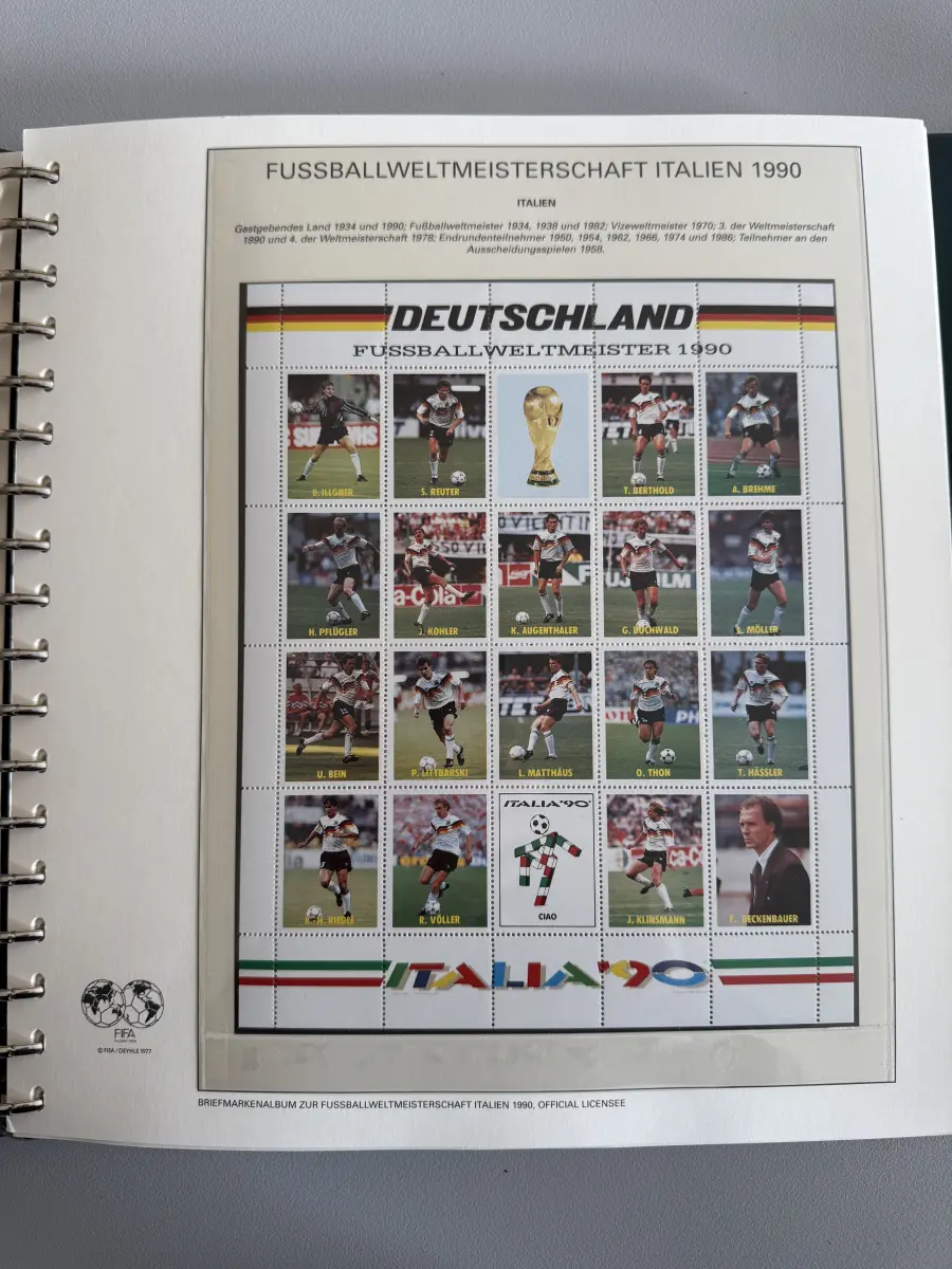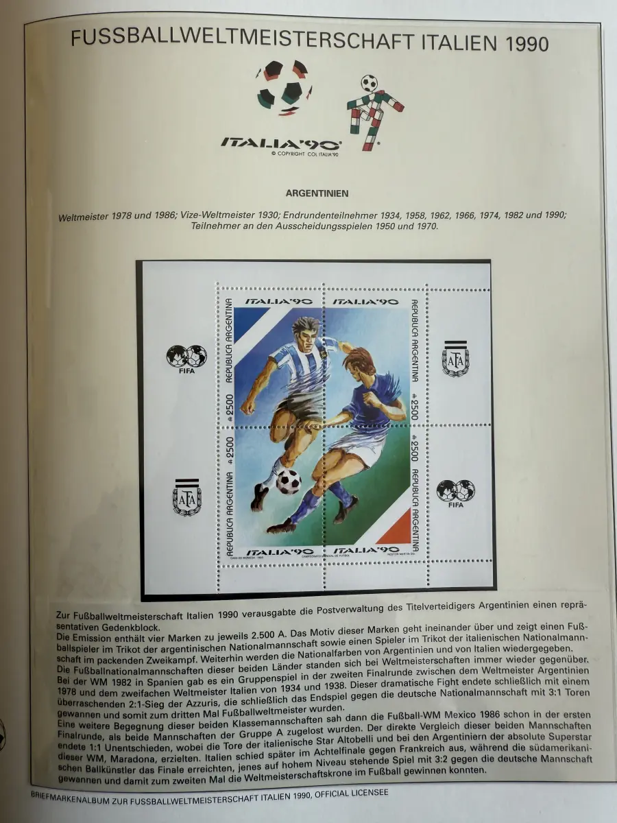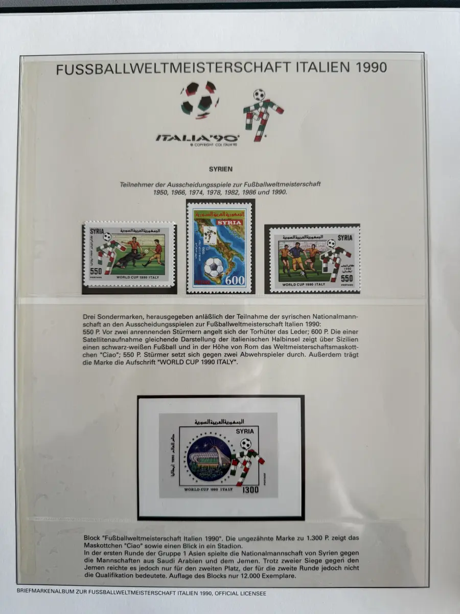 Sammlung zur Fußball-Weltmeisterschaft 1990 in Italien, in drei prallvollen offiziellen FIFA-Vordruckbindern nach Sieger-Abo gesammelt. Die gut erhaltenen grünen Lindner-T-Vordruckbinder zeigen alle die passende Goldprägung. Auf über 140 Vordruckblättern finden sich die postfrischen Briefmarken und Blöcke von A bis Z, die zu diesem Anlass erschienen sind - ergänzt mit interessanten Belegen. Auch bessere ungezähnte Parallelausgaben sind dabei. Der Abopreis war gigantisch!