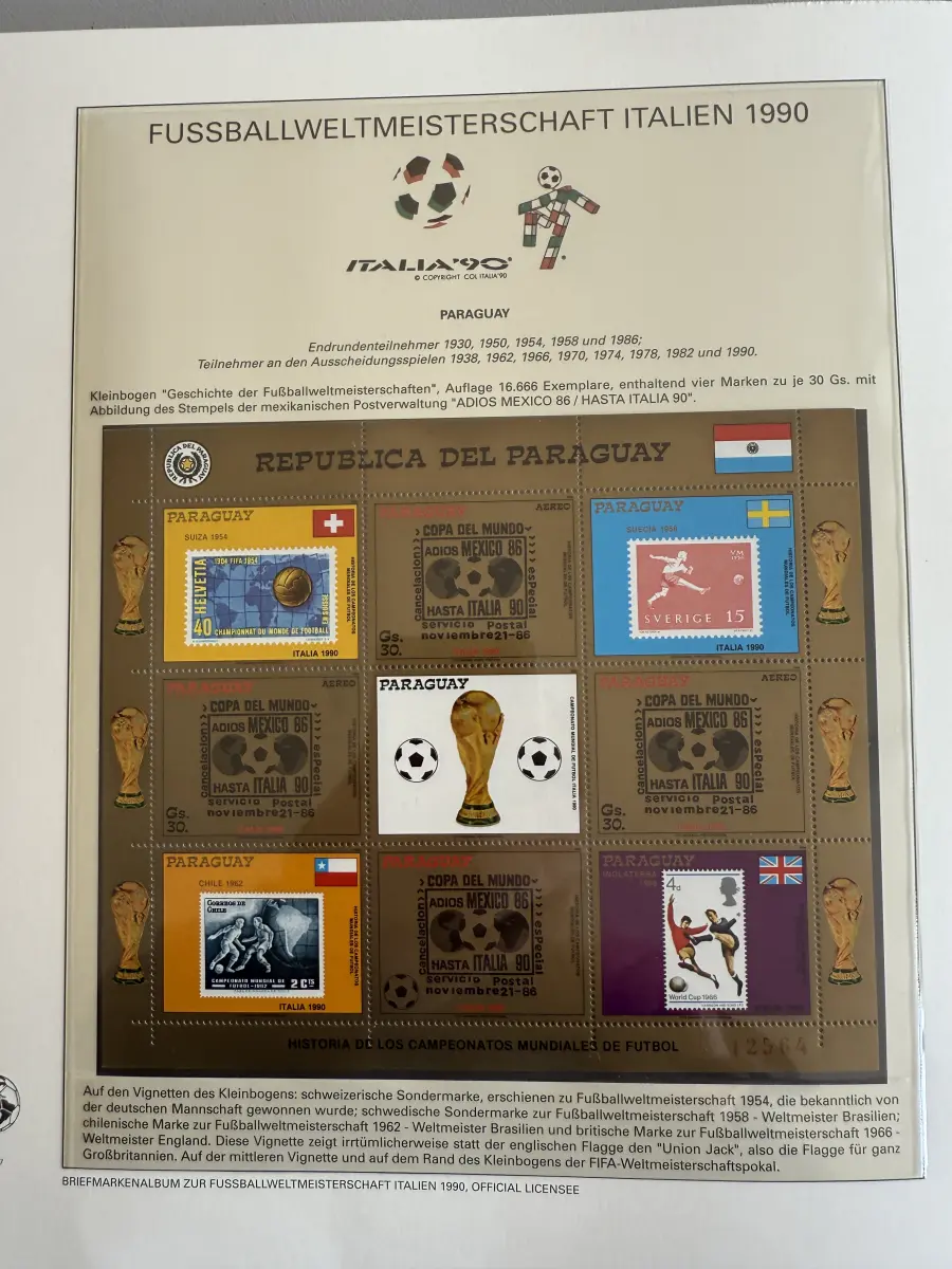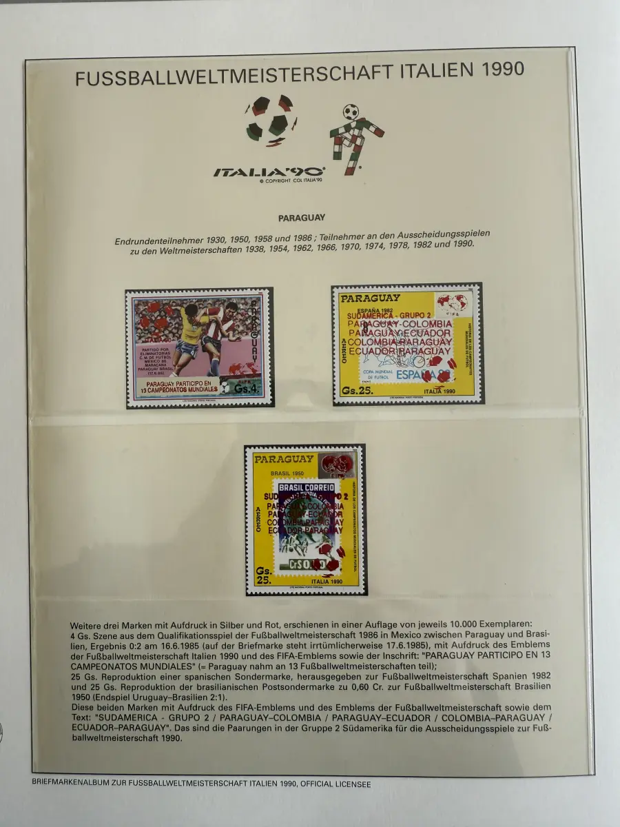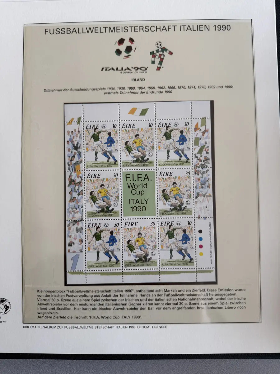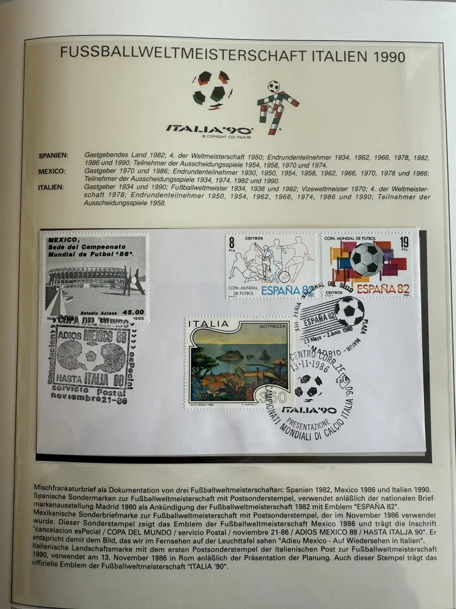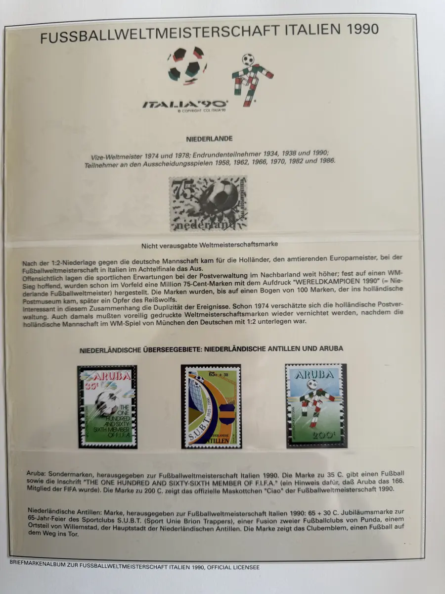 Sammlung zur Fußball-Weltmeisterschaft 1990 in Italien, in drei prallvollen offiziellen FIFA-Vordruckbindern nach Sieger-Abo gesammelt. Die gut erhaltenen grünen Lindner-T-Vordruckbinder zeigen alle die passende Goldprägung. Auf über 140 Vordruckblättern finden sich die postfrischen Briefmarken und Blöcke von A bis Z, die zu diesem Anlass erschienen sind - ergänzt mit interessanten Belegen. Auch bessere ungezähnte Parallelausgaben sind dabei. Der Abopreis war gigantisch!