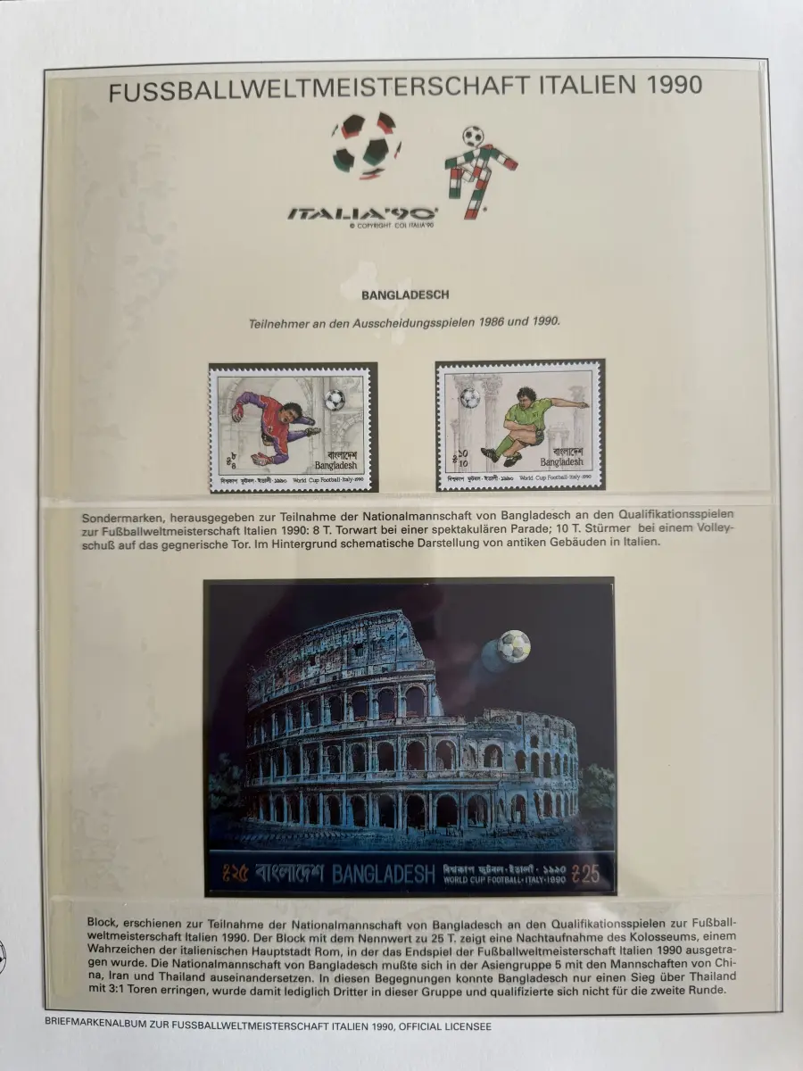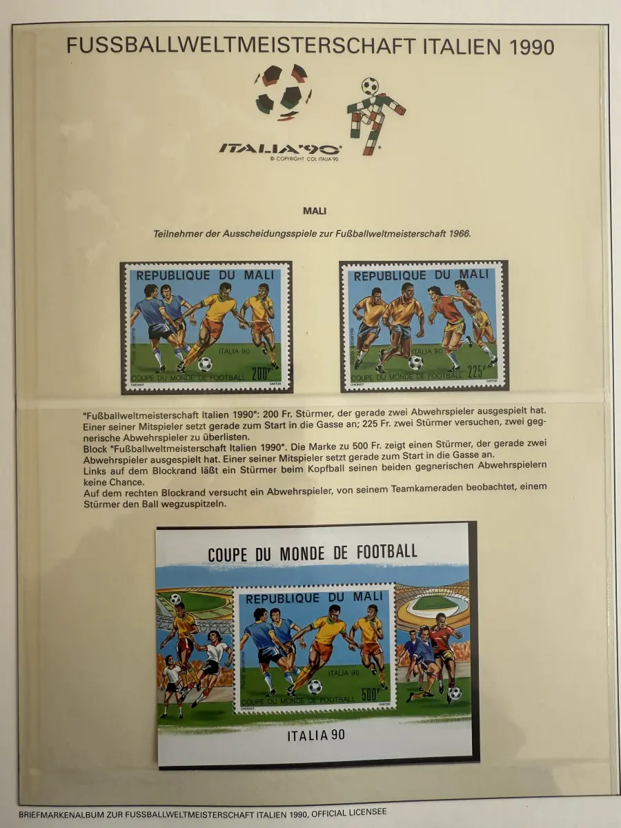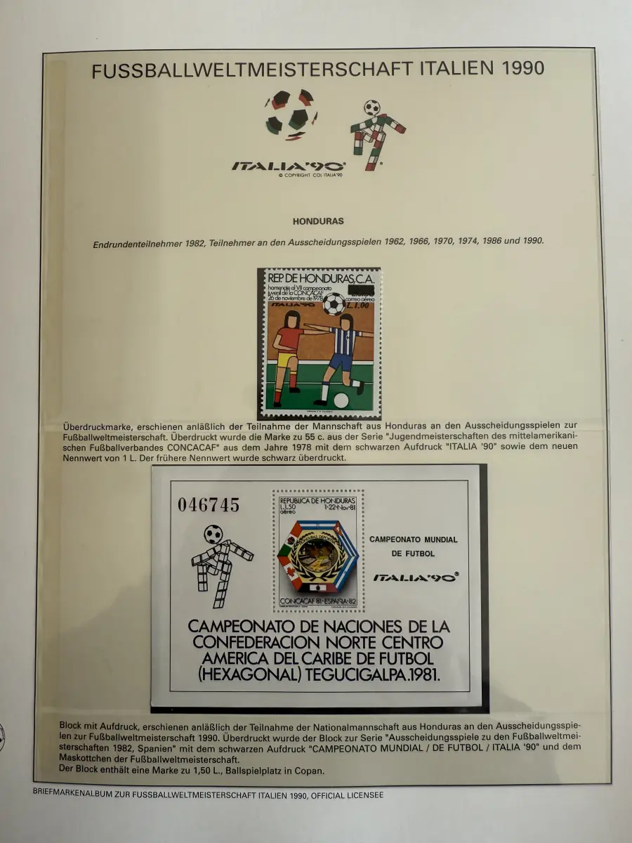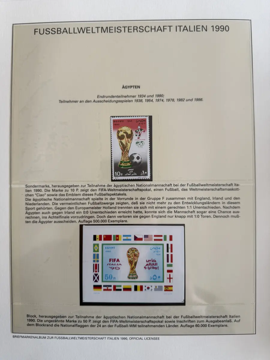 Sammlung zur Fußball-Weltmeisterschaft 1990 in Italien, in drei prallvollen offiziellen FIFA-Vordruckbindern nach Sieger-Abo gesammelt. Die gut erhaltenen grünen Lindner-T-Vordruckbinder zeigen alle die passende Goldprägung. Auf über 140 Vordruckblättern finden sich die postfrischen Briefmarken und Blöcke von A bis Z, die zu diesem Anlass erschienen sind - ergänzt mit interessanten Belegen. Auch bessere ungezähnte Parallelausgaben sind dabei. Der Abopreis war gigantisch!