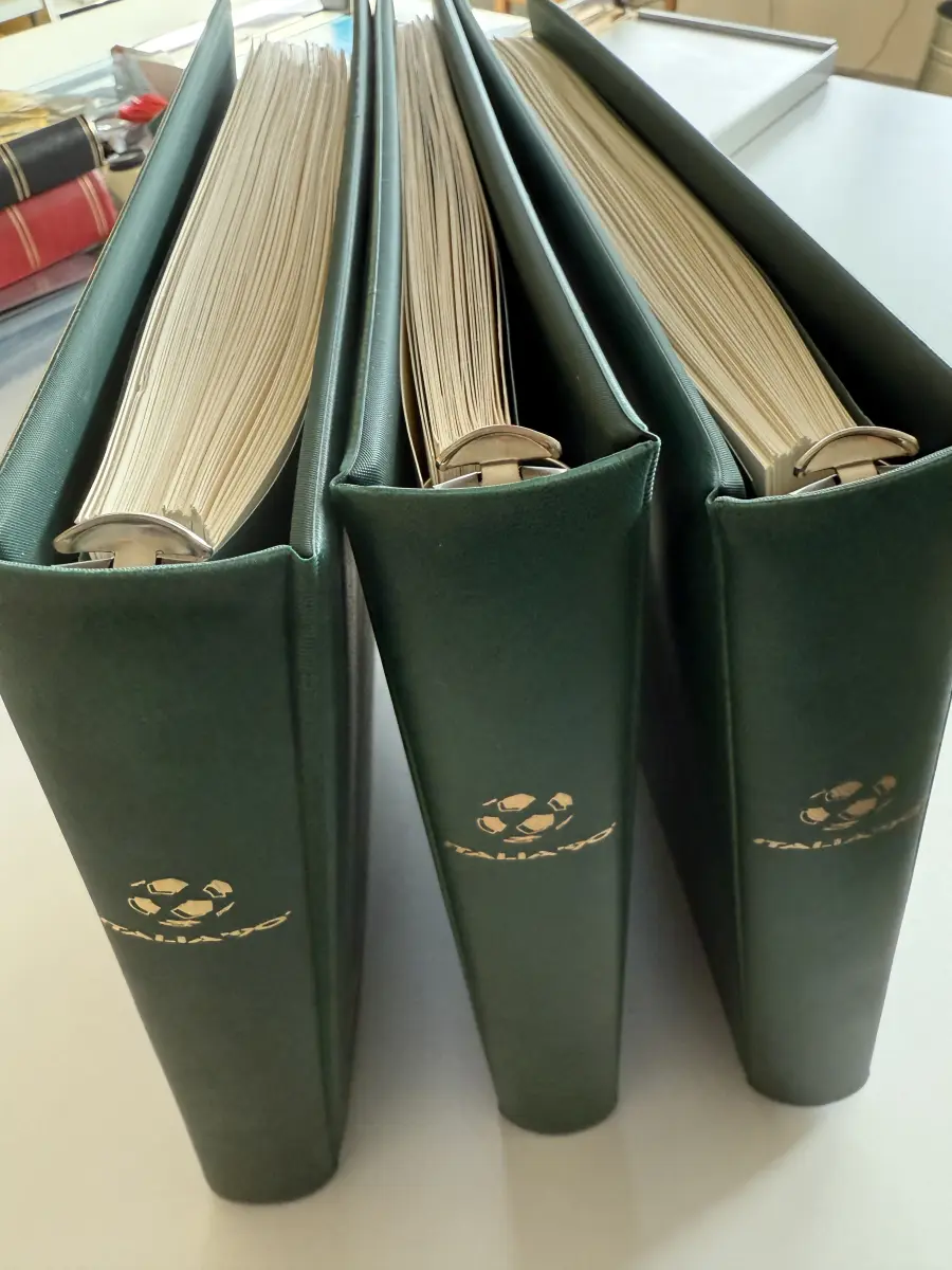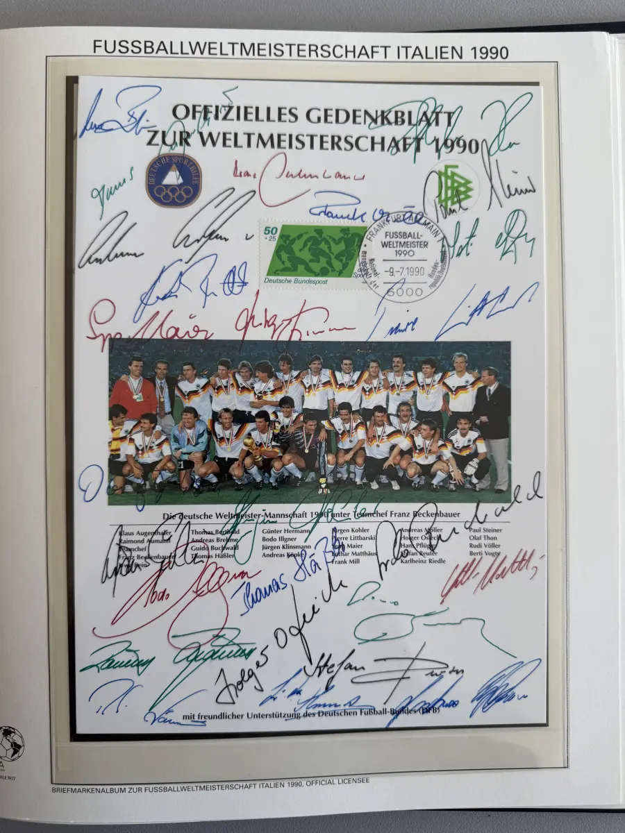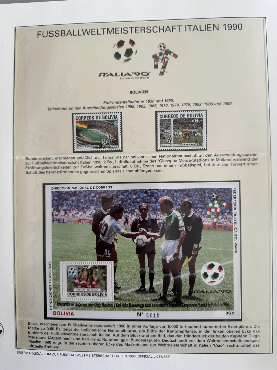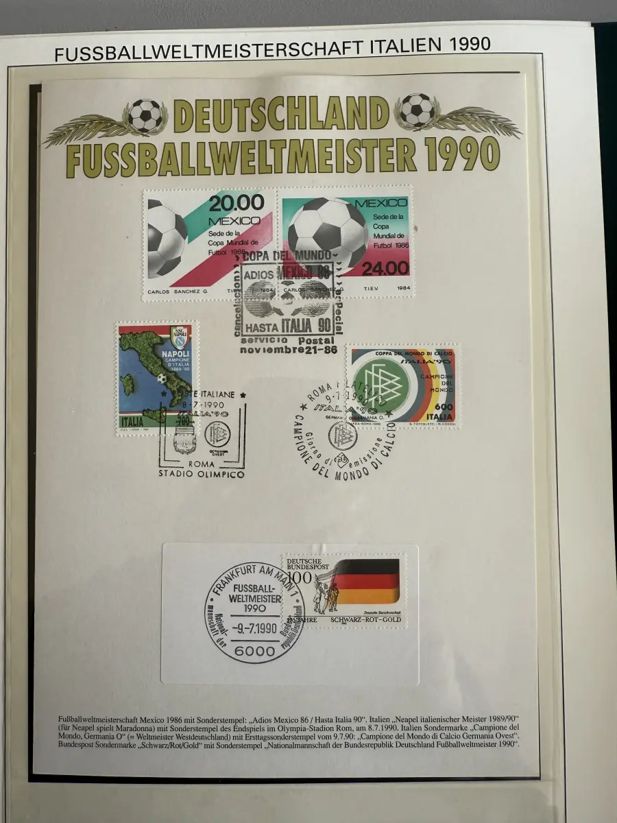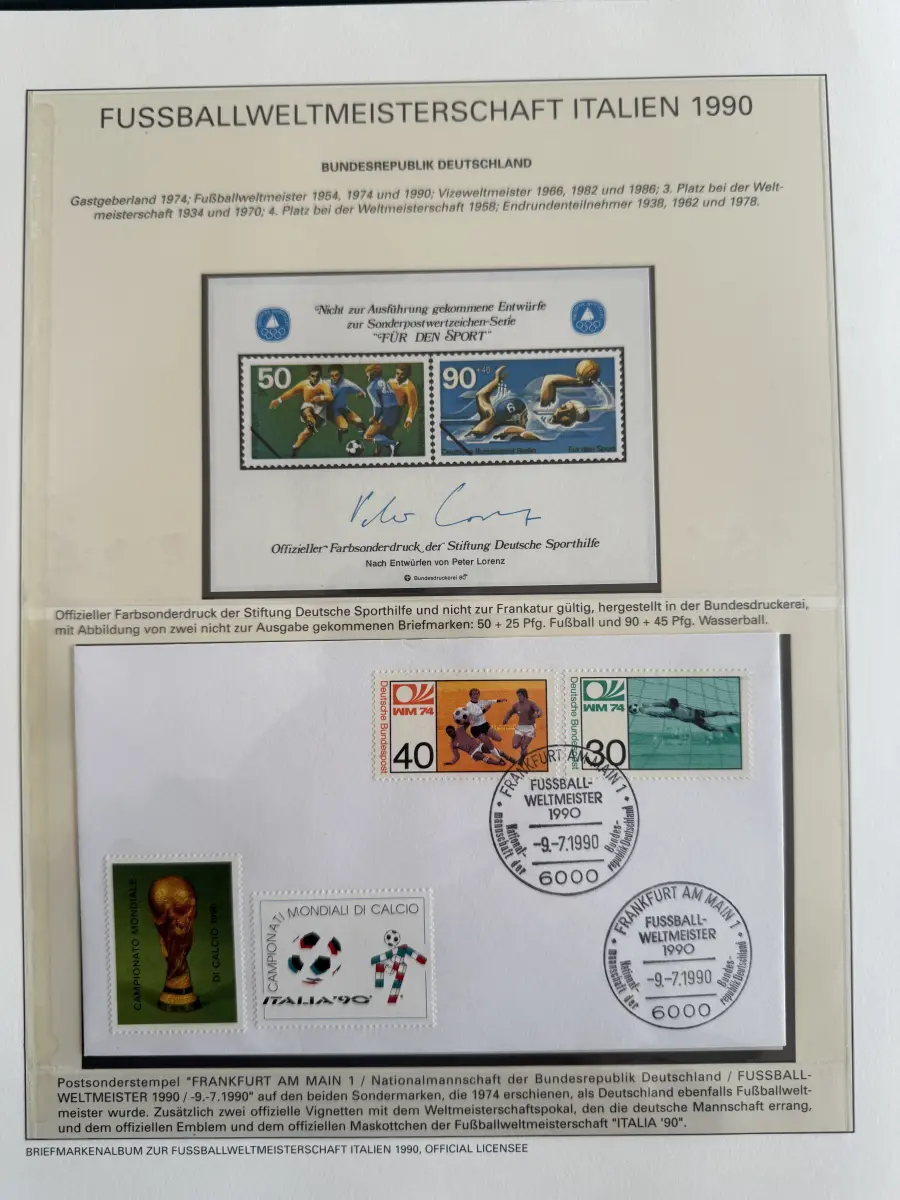 Sammlung zur Fußball-Weltmeisterschaft 1990 in Italien, in drei prallvollen offiziellen FIFA-Vordruckbindern nach Sieger-Abo gesammelt. Die gut erhaltenen grünen Lindner-T-Vordruckbinder zeigen alle die passende Goldprägung. Auf über 140 Vordruckblättern finden sich die postfrischen Briefmarken und Blöcke von A bis Z, die zu diesem Anlass erschienen sind - ergänzt mit interessanten Belegen. Auch bessere ungezähnte Parallelausgaben sind dabei. Der Abopreis war gigantisch!