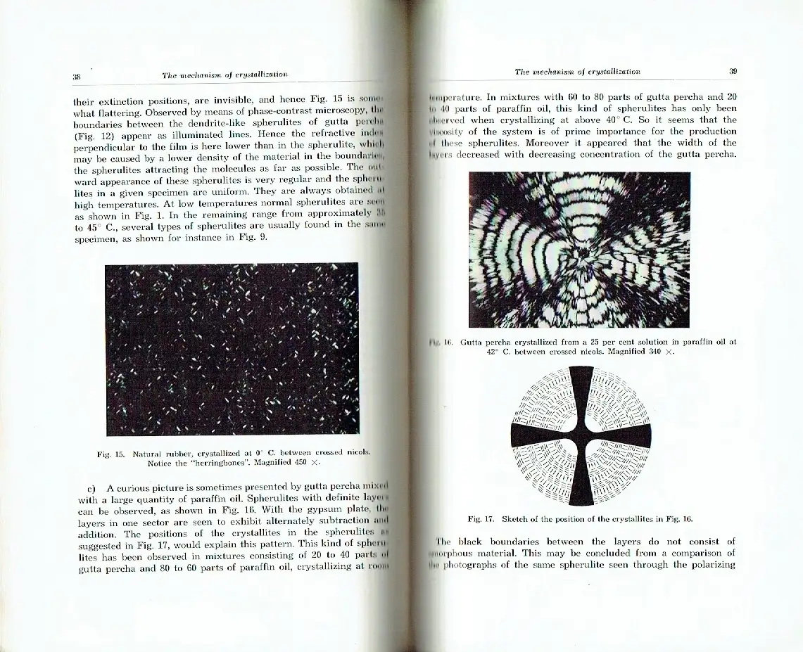 guter Zustand, Gebrauchs- und Alterungsspuren: ehemaliges Bibliotheksexemplar mit Rückenetikett, Etikett mit Folie überklebt bis weit in beide Buchdeckel hinein - Titel mit Stempeln und Notizen - Deckel innen mit angeklebtem Papierrest - Seiten aber sauber und ordentlich - Umschlag und Seiten teils etwas eselsohrig, Some general remarks about crystallization - Crystallization of monomeric substances - Liquid crystals - Crystallization of high polymers - The second-order transition point - Survey of the literature about spherulites in high polymers. - The discovery of spherulites - The structure of spherulites - The growth and the melting of spherulites - Former explanations of the formation of spherulites - The mechanism of crystallization - The "auto-orientation" of macro-molecules during crystallization - The formation of normal spherulites - The structure of special spherulites - The absence of spherulites in high polymers - The continuity of the crystal-lattice in high polymers - Some preliminary remarks - The continuity of the crystal-lattice within a spherulite - The continuity of the crystal-lattice in oriented fibres - The continuity of the crystal-lattice in stretched rubbers - The occurrence of crystallites - The rate of crystallization and the melting range of high polymers - The crystallization curves - The melting of natural rubber - The crystallization of emulsions of polymers - The prospects of a mathematical formulation of the crystallization and melting of high polymers - Suggestions for a further investigation into the crystallization of high polymers - Summary - References, kartoniert, ca. 15,5 x 24, 82 Seiten mit 35 Bildern