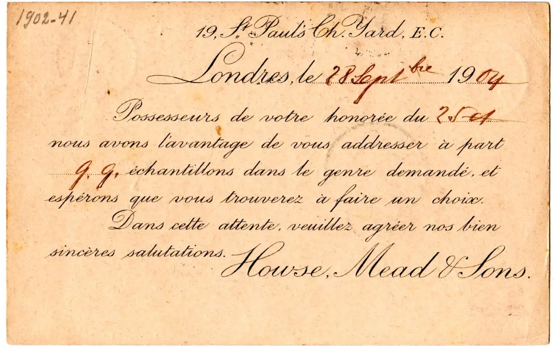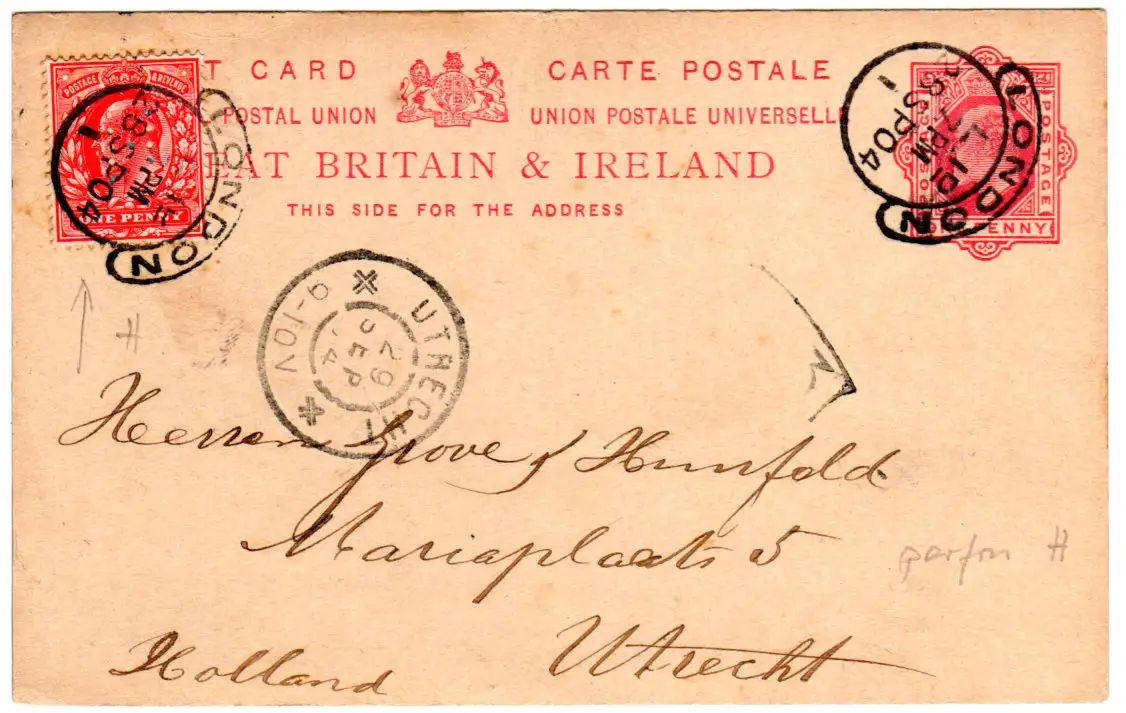 1 d m. Firmenlochung H (Howse Mead & Sons) auf Ganzsache m. entsprechendem rücks. Zudruck v. London n. Utrecht.