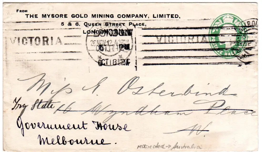 Ga-Umschlag m. Zudruck The Mysore Gold Mining Company, Limited als Ortssendung London, dann Nachsendung n. Melbourne, Australien (Ank.Stpl. vorderseitig!).