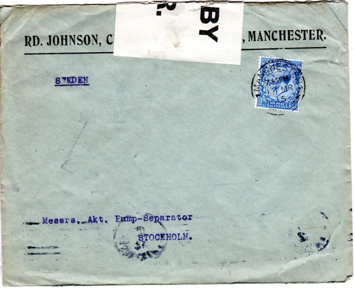 GB 1915, 2 1/2d with perfin on censored envelope from Manchester to Sweden