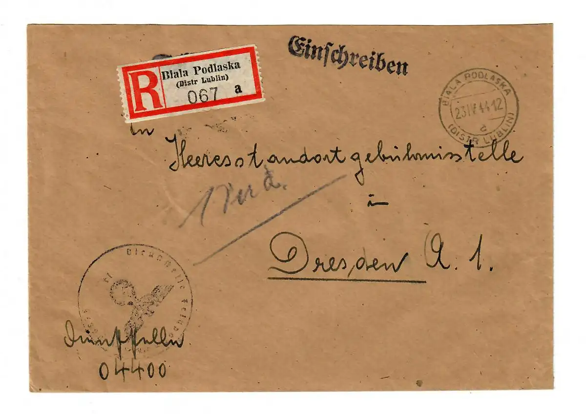 GG 1944 Feldpost: lettre recommandée Biala Podlaska au bureau des taxes de l'État de guerre