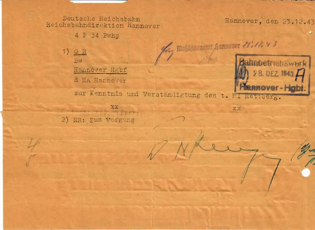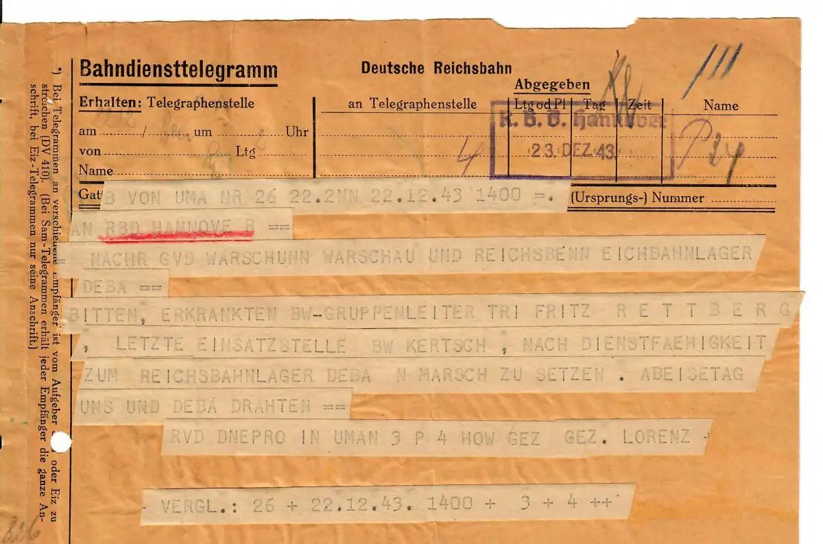 Formulaire GG: Télégramme ferroviaire: Varsovie - Hanovre, formulaire rare 1943