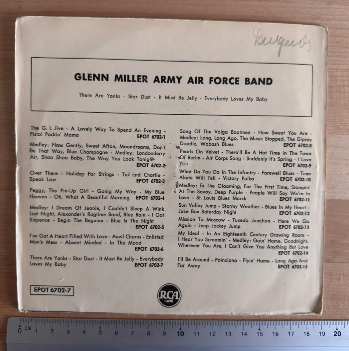 Titel & Inhalt: Plattennummer: Glenn Miller (1904–1944) war einer der bekanntesten amerikanischen Bandleader der Swing-Ära. Seine Army Air Force Band spielte während des Zweiten Weltkriegs für US-Truppen in Europa. Die Aufnahmen gelten heute als bedeutende musikalische Zeitdokumente.