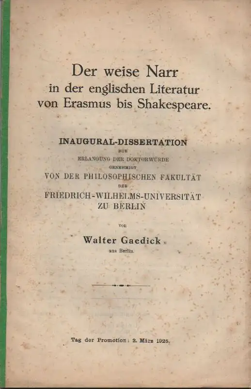 Gaedick, Walter: Der weise Narr in der englischen Literatur von Erasmus bis Shakespeare. (Dissertation).