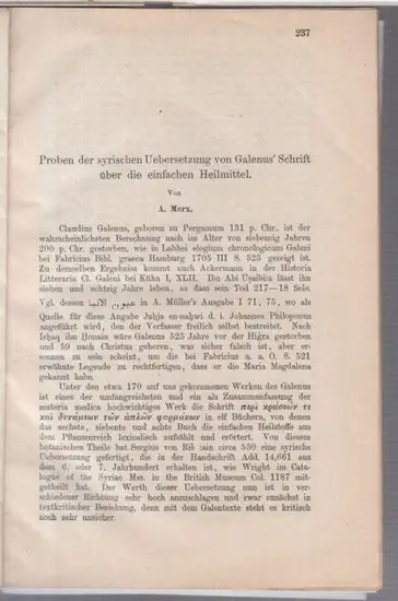 Galenus / Galenos / Galen. - A. Merx / mit einer Erwiderung von Immanuel Löw: Problem der syrischen Uebersetzung von Galenus' Schrift über die einfachen Heilmittel. - Aus: ZDMG, Zeitschrift der deutschen morgenländischen Gesellschaft, Band 39 (1885). - In